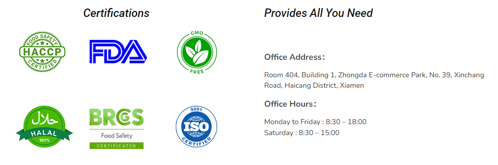 | Skírteini | HACCP/ISO/KOSHER/FDA/ECO CERT/BRC |